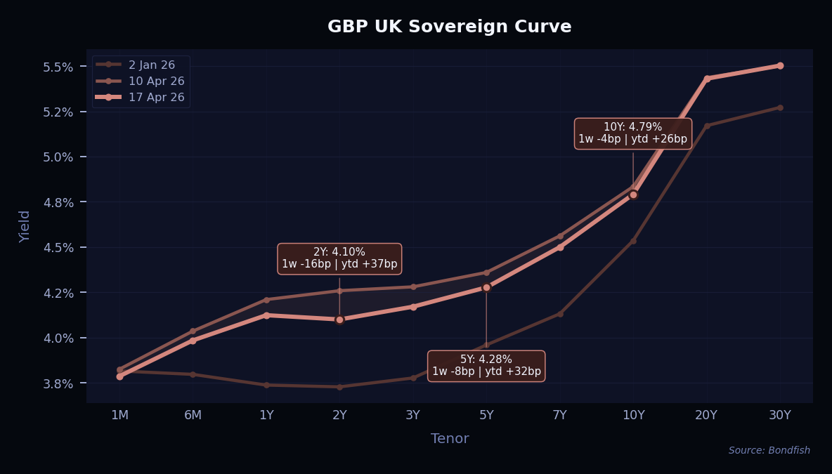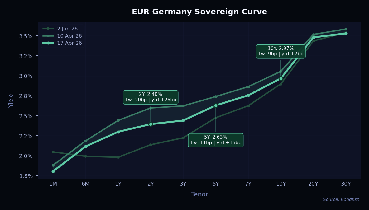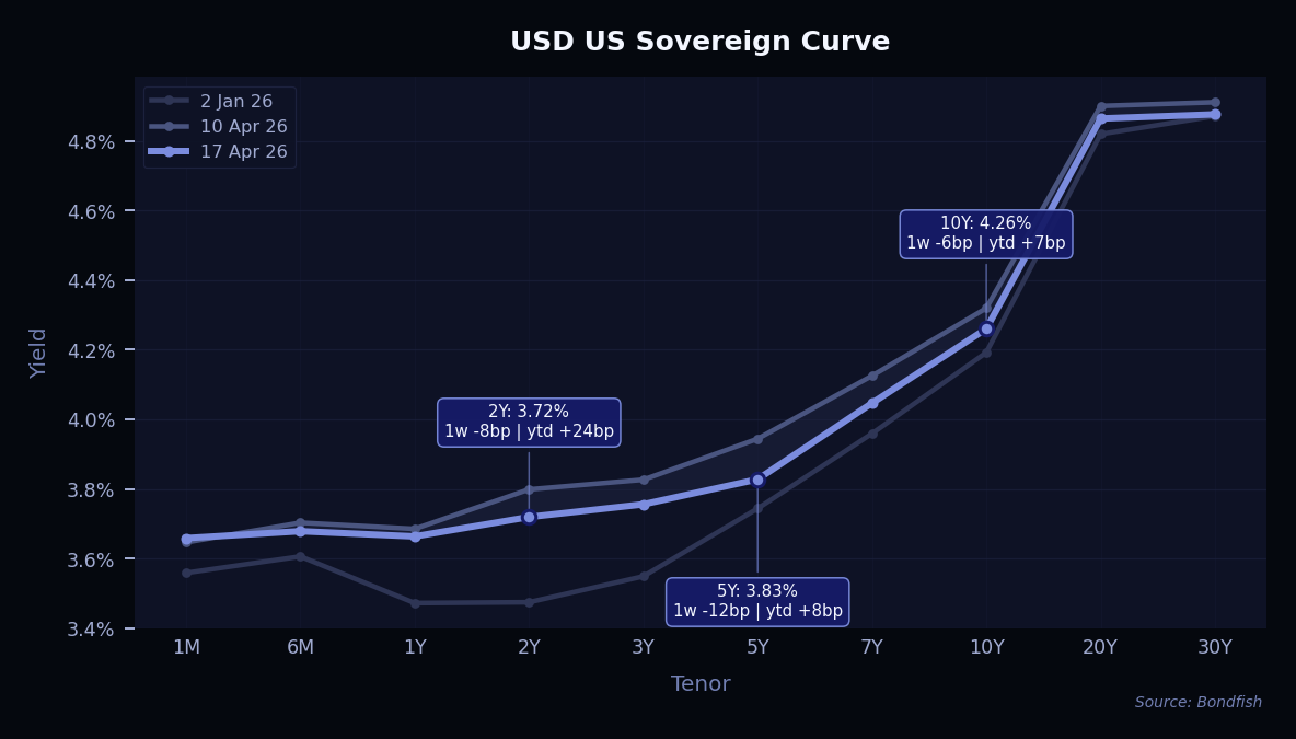 Developed market yield curves moved lower this week, with the front end leading the rally as easing energy prices and more constructive headlines around the Middle East improved sentiment. European rates outperformed, helped by softer ECB communication, which reduced expectations of an immediate rate hike. At the same time, the move was only a partial reversal of the earlier sell-off, as investors remain cautious that geopolitical tensions and inflation risks could persist. Overall, markets became a bit more comfortable with the near-term outlook, but not enough to fully price out uncertainty. For now, maintaining a cautious stance in a fixed-income portfolio seems reasonable: avoid large outright duration bets, stay selective, and focus on shorter- to intermediate-maturity exposure while keeping flexibility in case geopolitical risks flare up again.