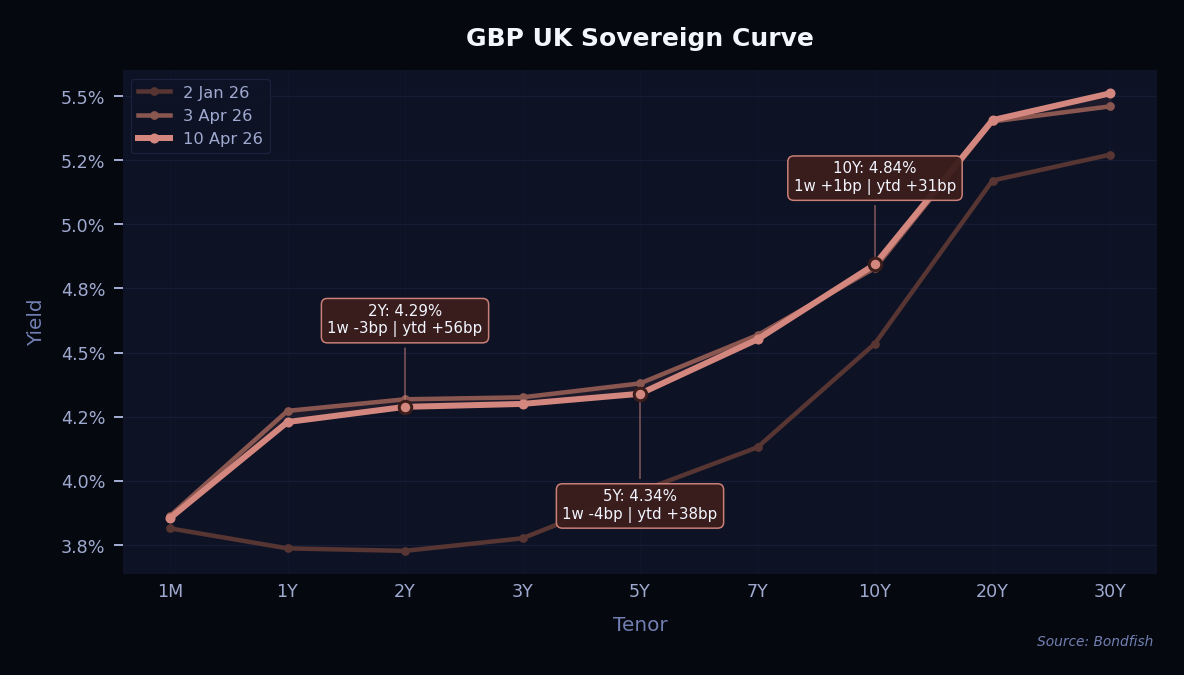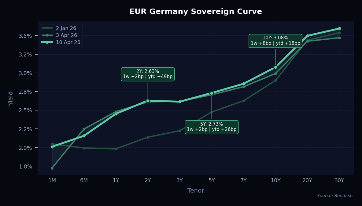 Developed market yield curves moved in different directions this week as investors balanced some relief from the Middle East ceasefire against the risk that energy prices, especially gas in Europe, may stay elevated for longer. The main message from the market was that the shock has eased, but not disappeared. US yields were helped by this partial relief, while the UK market stayed more mixed. In Europe, the move was firmer at the long end, as investors remained cautious that sticky energy prices could keep inflation pressure alive and limit room for rate cuts. Overall, the tone suggests that markets are no longer pricing a full stress scenario, but they are also not ready to fully reverse the earlier repricing while geopolitical and energy uncertainty remains high. For allocation, we remain cautious on duration for now, with a preference for shorter maturities in Europe, while long-dated bonds are becoming more interesting for long-term investors as yields stay elevated.