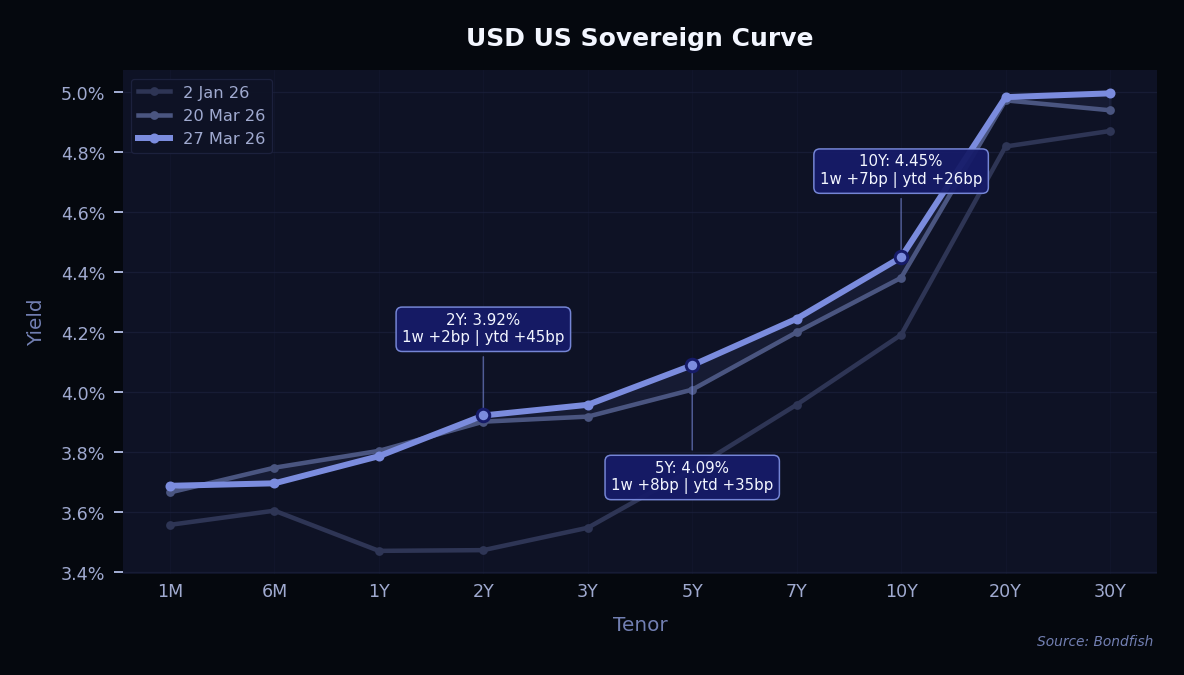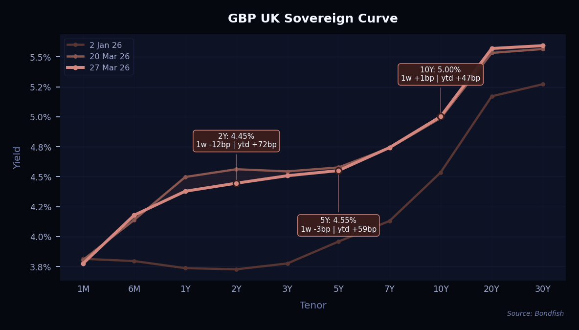 Developed market yield curves were little changed overall last week, even though energy prices and Middle East headlines remained the main themes in the background. Moves were modest across the US, UK and Germany, with most key tenors changing only slightly over the week.